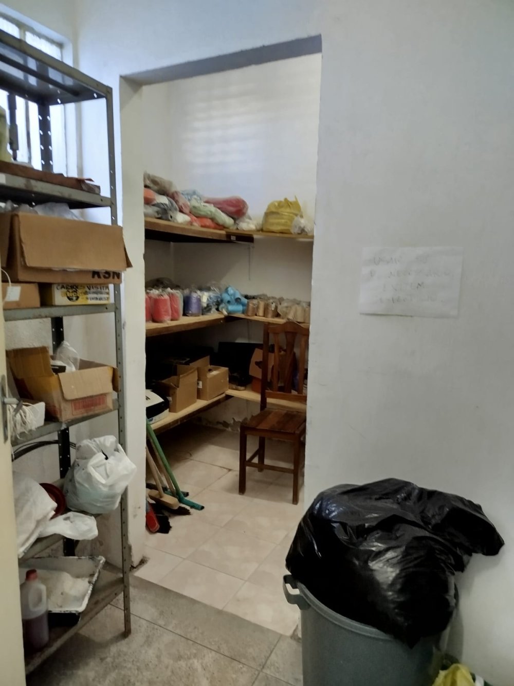 2 mesas, 6 cadeiras, bancos, baldes e lixeiras, 8 estantes de aço, porta tubos de linha