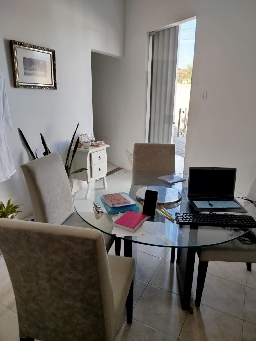 5- Recepção com lavabo = mesa, cadeira, 3 poltronas, arara, estante